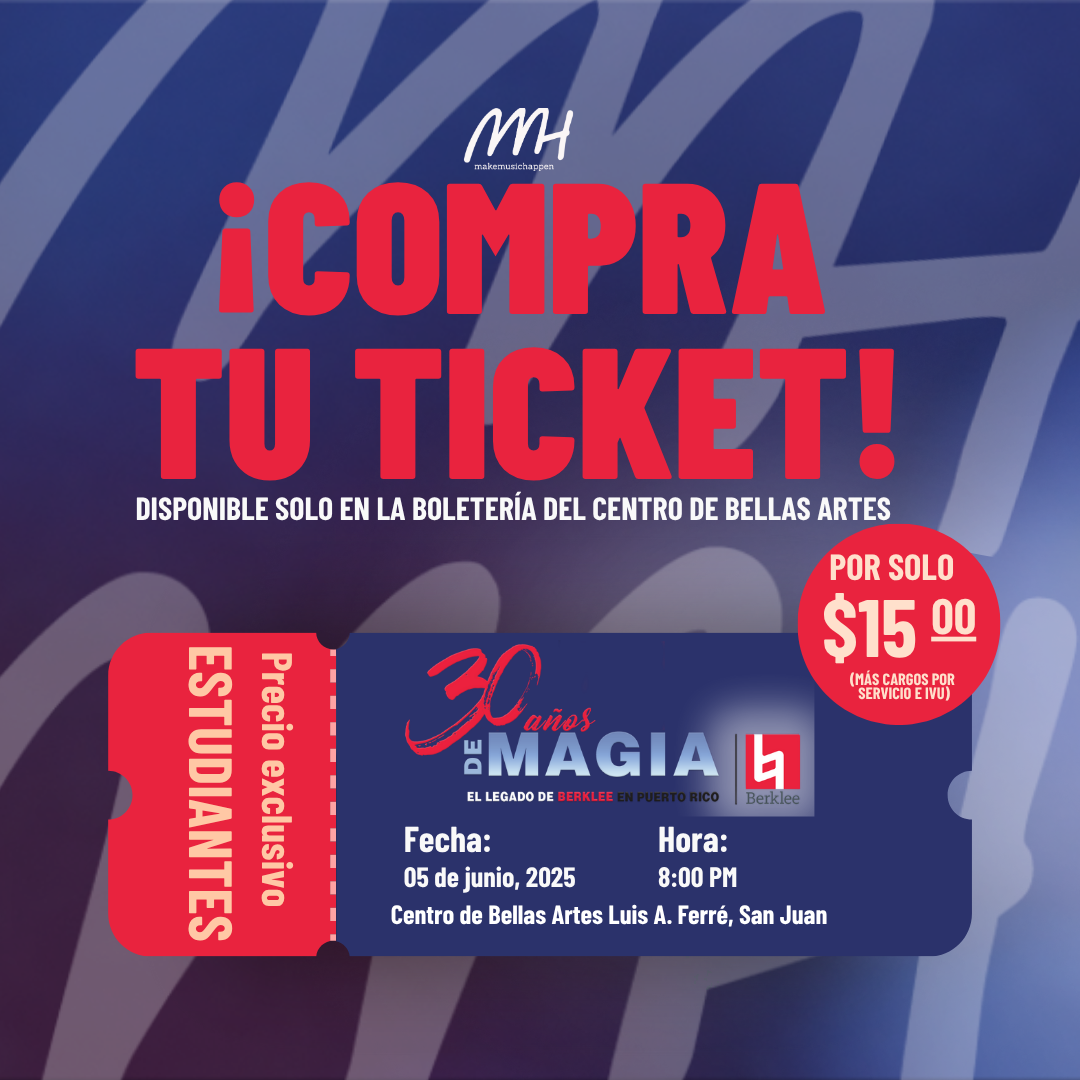 Make Music Happen y el Centro de Bellas Artes Luis A. Ferré de San Juan se complacen en invitar a todos los estudiantes del Departamento de Educación de Puerto Rico (DE) a vivir la experiencia del concierto 30 Años de Magia: El Legado de Berklee en Puerto Rico, que se celebrará el jueves, 5 de junio como parte de la histórica conmemoración del trigésimo aniversario del programa Berklee en Puerto Rico.